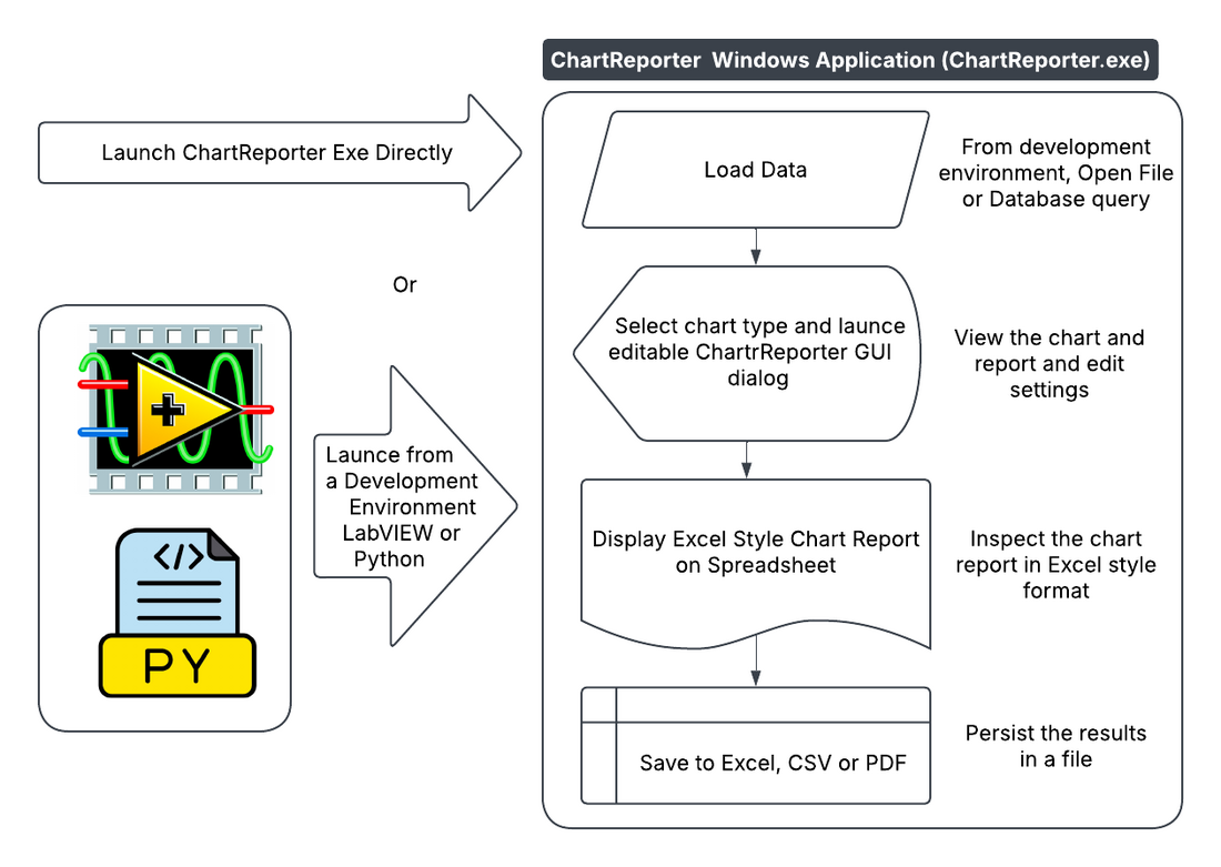 ChartReporter provides for running from an external software program such as LabVIEW or Python or running it as a standalone application.